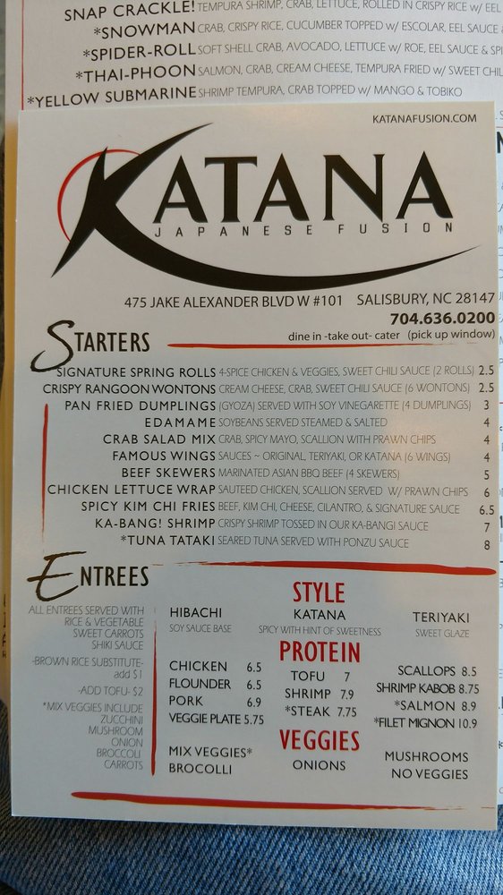 Welcome to Katana Fusion, a delightful Japanese restaurant located at 475 Jake Alexander Blvd W, Salisbury, NC. This vibrant eatery specializes in a diverse menu that brings together traditional Japanese flavors with modern twists, offering something for everyone. Whether you're craving sushi, udon noodles, or hearty teriyaki chicken, Katana Fusion has you covered.